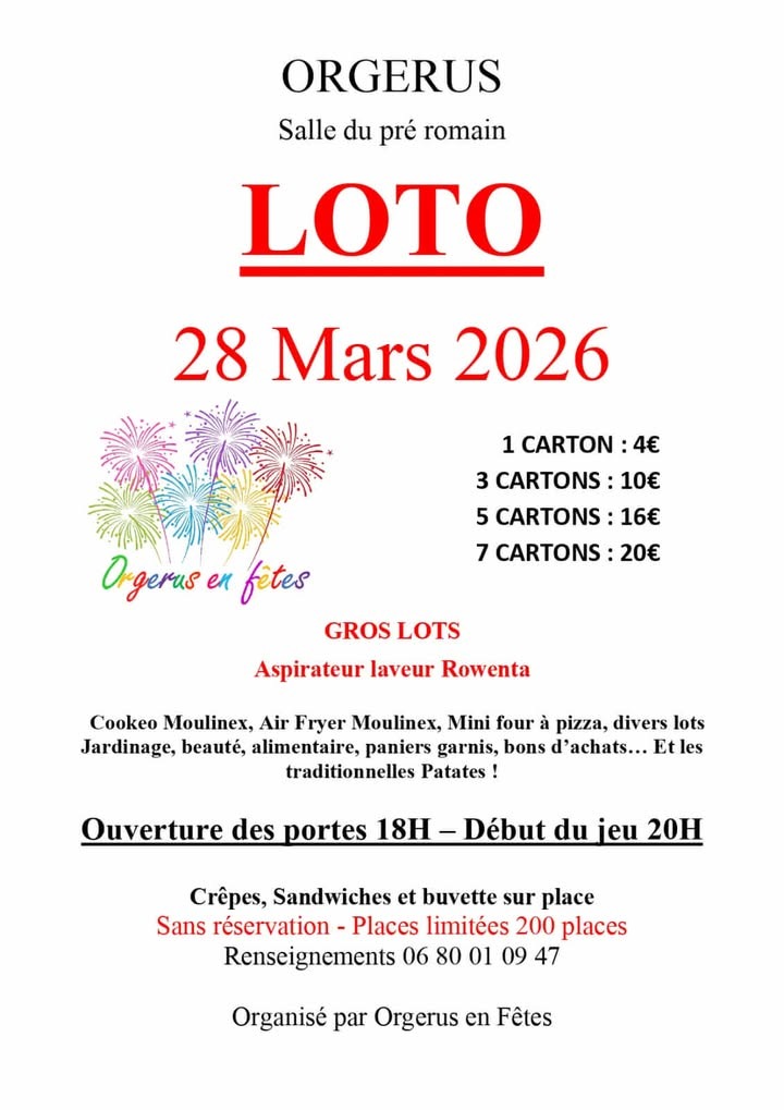 Orgerus en fêtes vous invite à un loto le samedi 28 mars à 18h, à la salle du pré romain à Orgerus (début du jeu 20h).