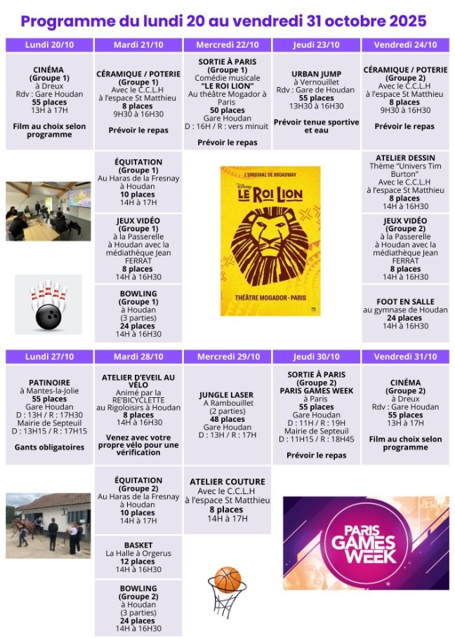 Activités proposées : cinéma, céramique/poterie, équitation, jeux vidéo, bowling, sortie à paris pour aller voir la comédie musicale "le roi lion" et/ou la Paris Game Week, urban jump, atelier dessin, foot en salle, patinoire, atelier d'éveil au vélo, basket, jungle laser, atelier couture...