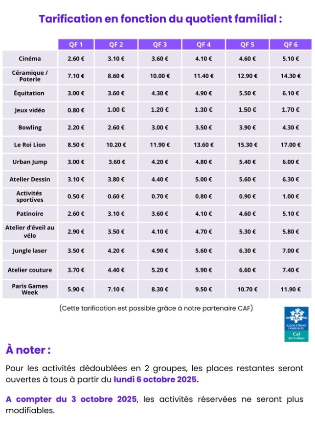 A noter : pour les activités dédoublées en 2 groupes, les places restantes seront ouvertes à tous à partir du lundi 6 octobre 2025.
