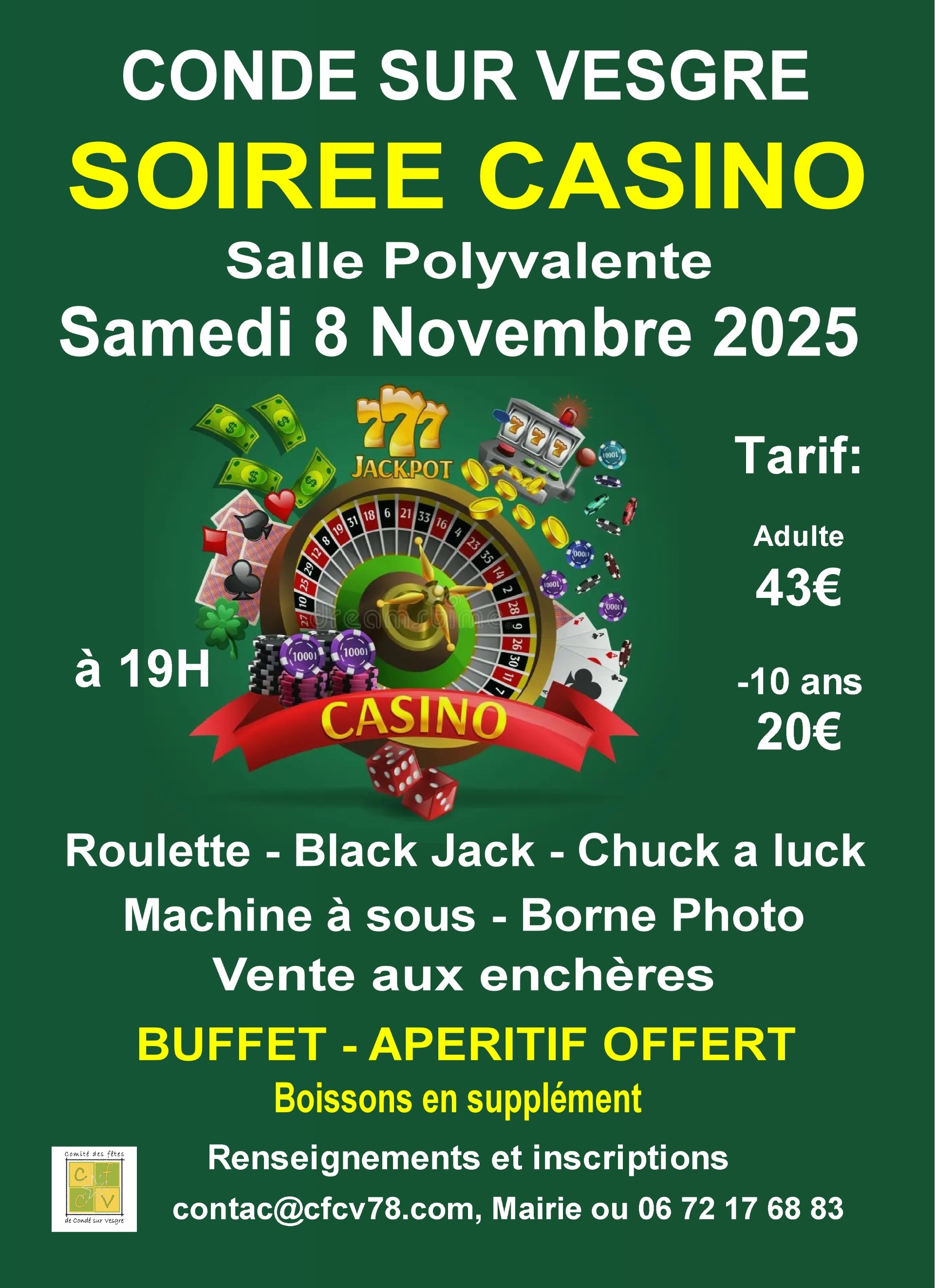 Le comité des fêtes de Condé-sur-Vesgre vous invite à une soirée Casino le samedi 8 novembre à la salle polyvalente de Condé-sur-Vesgre.