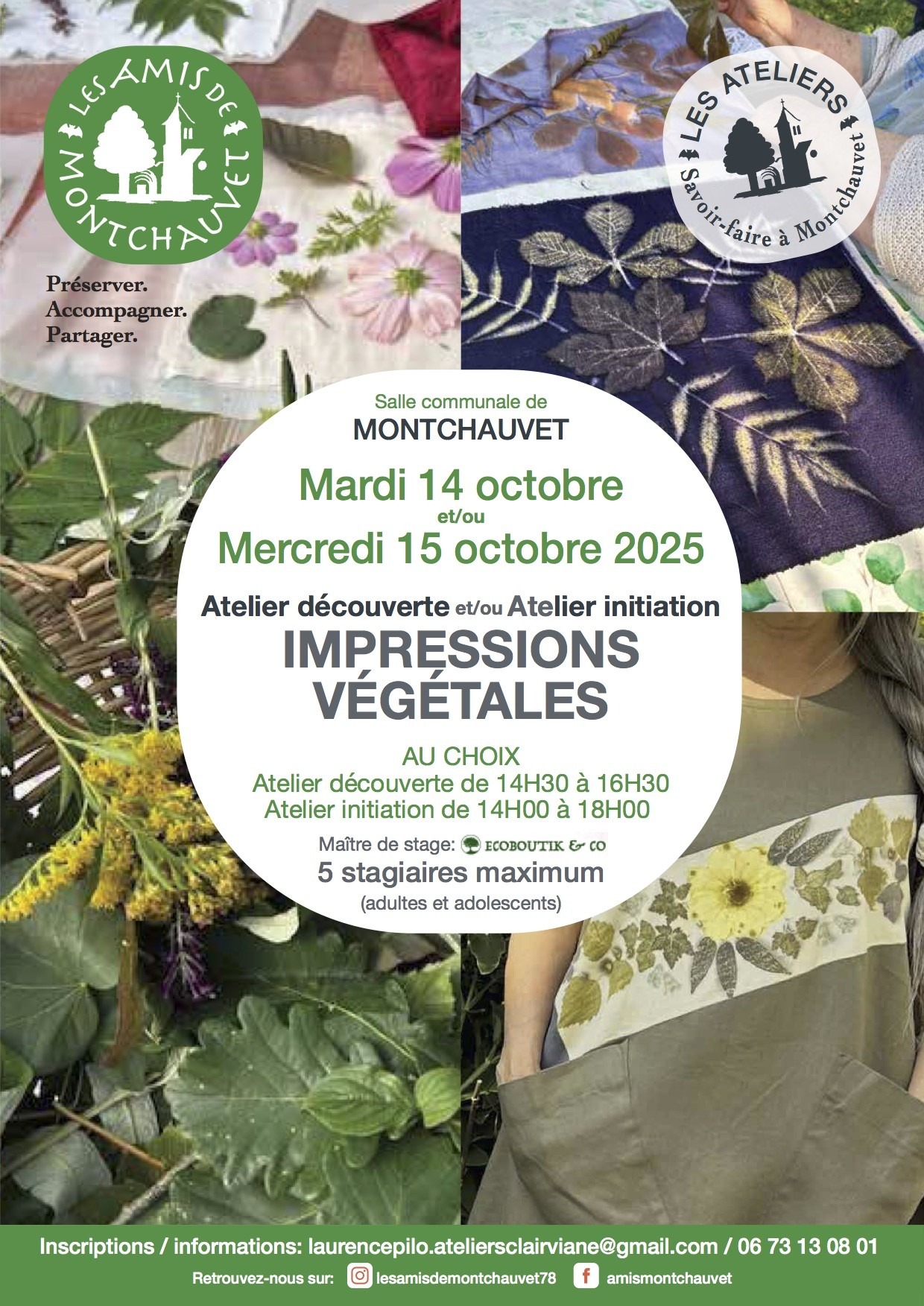 Les ateliers découverte et/ou initiation aux impressions végétales se dérouleront le mardi 14 et/ou le mercredi 15 octobre à la salle communale de Montchauvet.