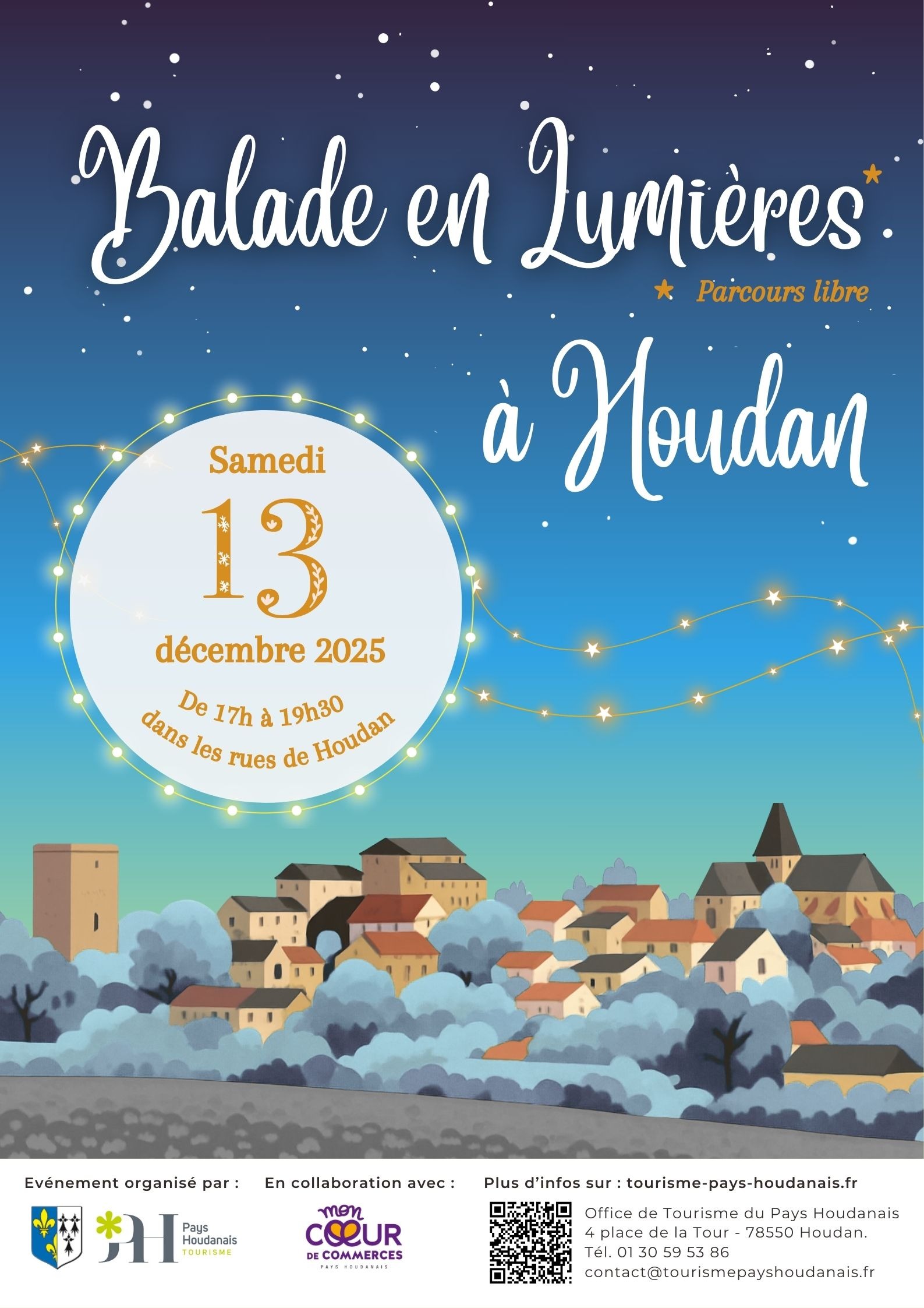 A l'approche de Noël, la Ville de Houdan, l’ACPH et l’Office de Tourisme du Pays Houdanais, vous invite à découvrir Houdan sous un nouveau jour, le samedi 13 décembre de 16h30 à 19h30, lors de l'évènement "Balade en Lumières 2025".