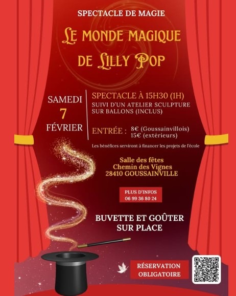 Le nombre de place étant limitées, l'inscription en ligne est obligatoire ici : https://www.helloasso.com/associations/apeg28/evenements/spectacle-de-magie-lilly-pop