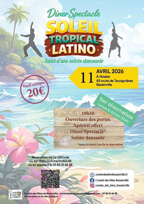Le Comité des Fêtes de Bazainville vous invite à dîner-spectacle "soleil tropical latino", suivi d'une soirée dansante à l'Atelier (Bazainville). le samedi 11 avril à 19h30.